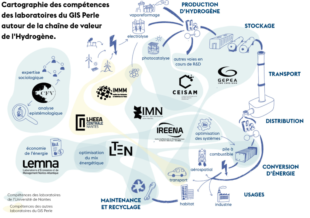 Nous pouvons également citer le GEPEA qui travaille sur la production d’hydrogène à partir de déchets et le laboratoire CEISAM (Chimie et interdisciplinarité, synthèse, analyse, modélisation) qui mène des recherches sur la production par photocatalyse, via les rayons du soleil.
