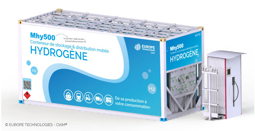 Solution mobile de stockage et de distribution d’hydrogène pour un usage lié à la mobilité dans un périmètre local grâce à un conteneur (Mhy500®) et une distributrice. Particulièrement adaptée aux besoins d’amorçage, aux chantier TP, aux bateaux et navires ou à l’organisation d’événements.