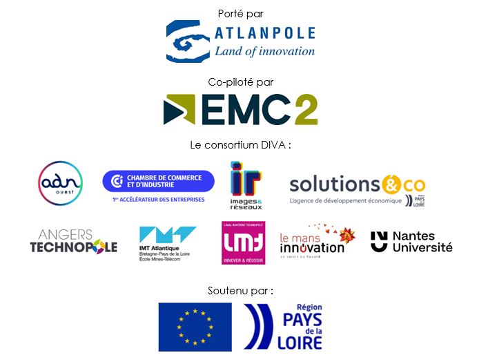 Le projet DIVA est porté par Atlanpole, acteur reconnu pour l’accompagnement des start-ups et PME innovantes des deeptech, et co-piloté avec le pôle de compétitivité EMC2, le pôle européen des technologies de fabrication. Accompagné par le consortium composé de Solutions&co, la CCI des Pays de la Loire, ADN Ouest, Images et réseaux, Laval Mayenne Technopole, Angers Technopole, Le Mans Innovation, IMT Atlantique et Nantes Université, le projet est soutenu par la Région des Pays de la Loire. Il fédère l’ensemble de l’écosystème IA et Robotique ligérien ; centres techniques et plateformes technologiques, réseau des Technocampus, acteurs de la formation et de la recherche, les pôles de compétitivité, acteurs de l’accompagnement de l’innovation (BIC, Technopoles, Incubateurs) et de la transformation numérique. DIVA sera déployé sur l’ensemble de la région des Pays de la Loire en lien avec les métropoles, les agglomérations et les technopoles régionales. DIVA s’inscrit dans la feuille de route stratégique numérique de la Région des Pays de la Loire.