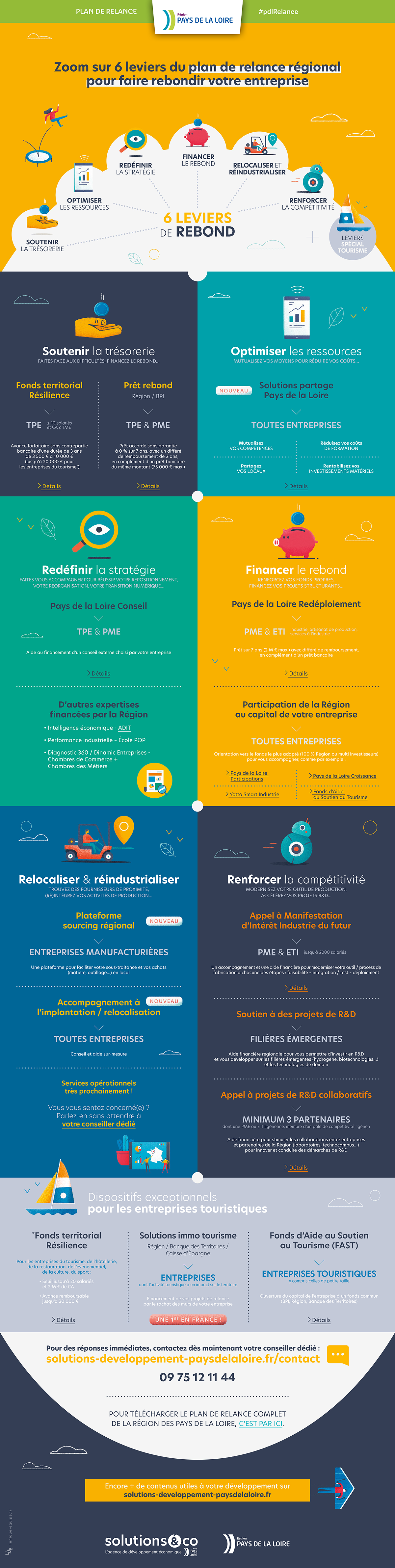 Les conseillers économiques de Solutions&co ont à coeur de vous accompagner dans la découverte et la compréhension des différentes aides dont vous pouvez bénéficier. Ils ont créé pour vous une infographie zoomant sur 6 leviers du plan de relance pour faire rebondir votre entreprise :